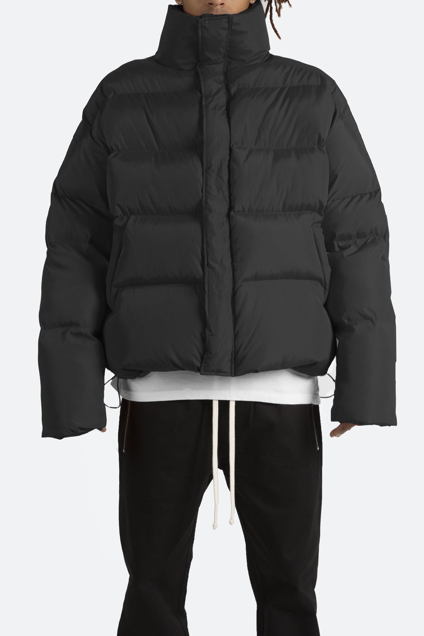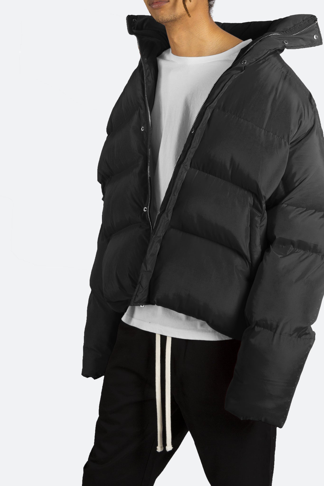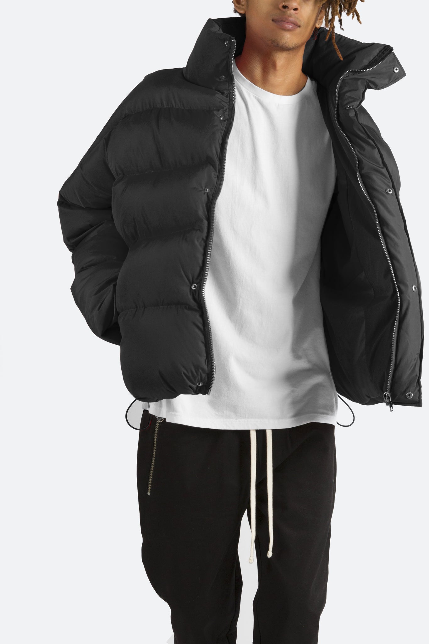 This Basic Puffer Jacket features zipper and snap closure placket, tall collar, tonal lining, polyester filled and quilted, and finished off with an oversized fit.