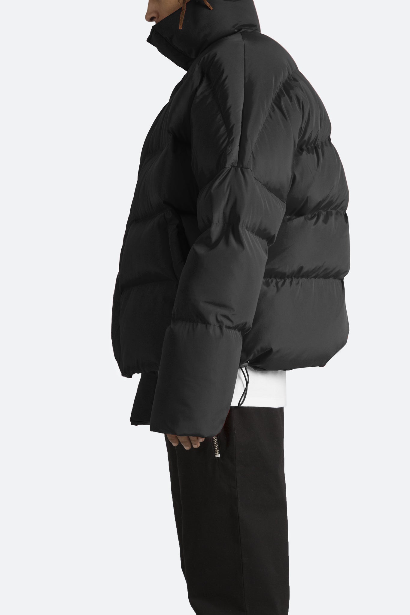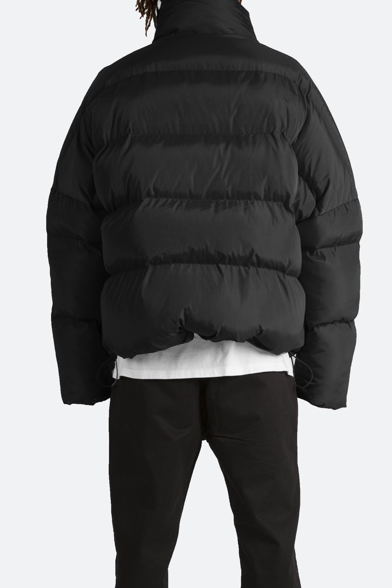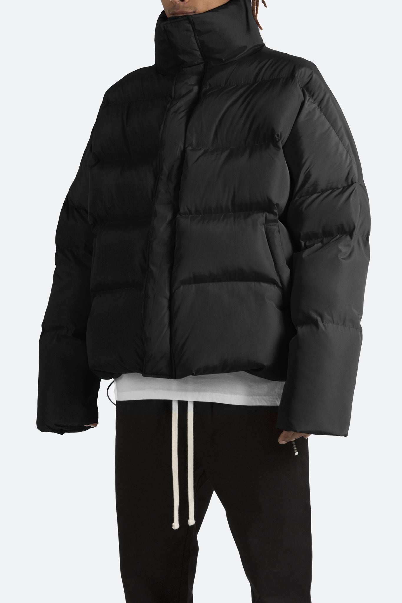 This Basic Puffer Jacket features zipper and snap closure placket, tall collar, tonal lining, polyester filled and quilted, and finished off with an oversized fit.