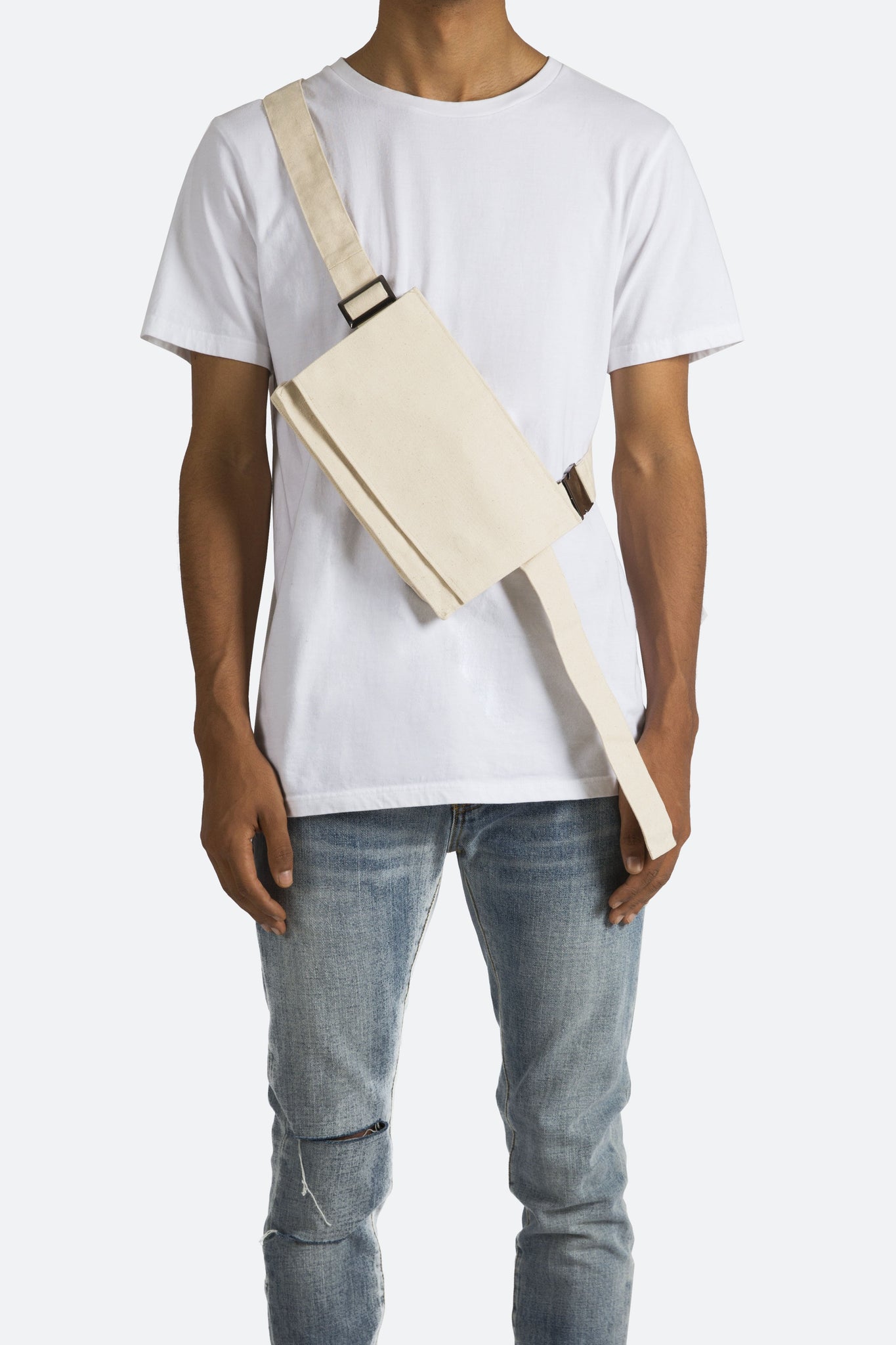 the Basic Shoulder Bag is constructed from cotton twill and features one large compartment that is closed using polished metal snaps and completed with a gunmetal closure on the self fabric strap.