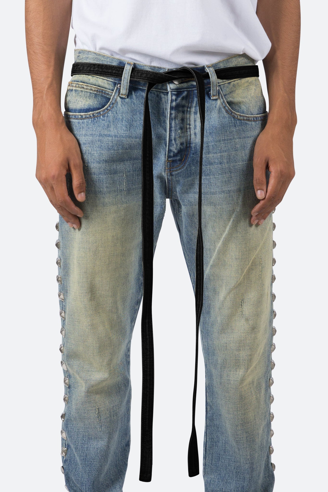 the Denim Belt is constructed of 3/4" wide 13.5 oz denim with double needle stitches all around.