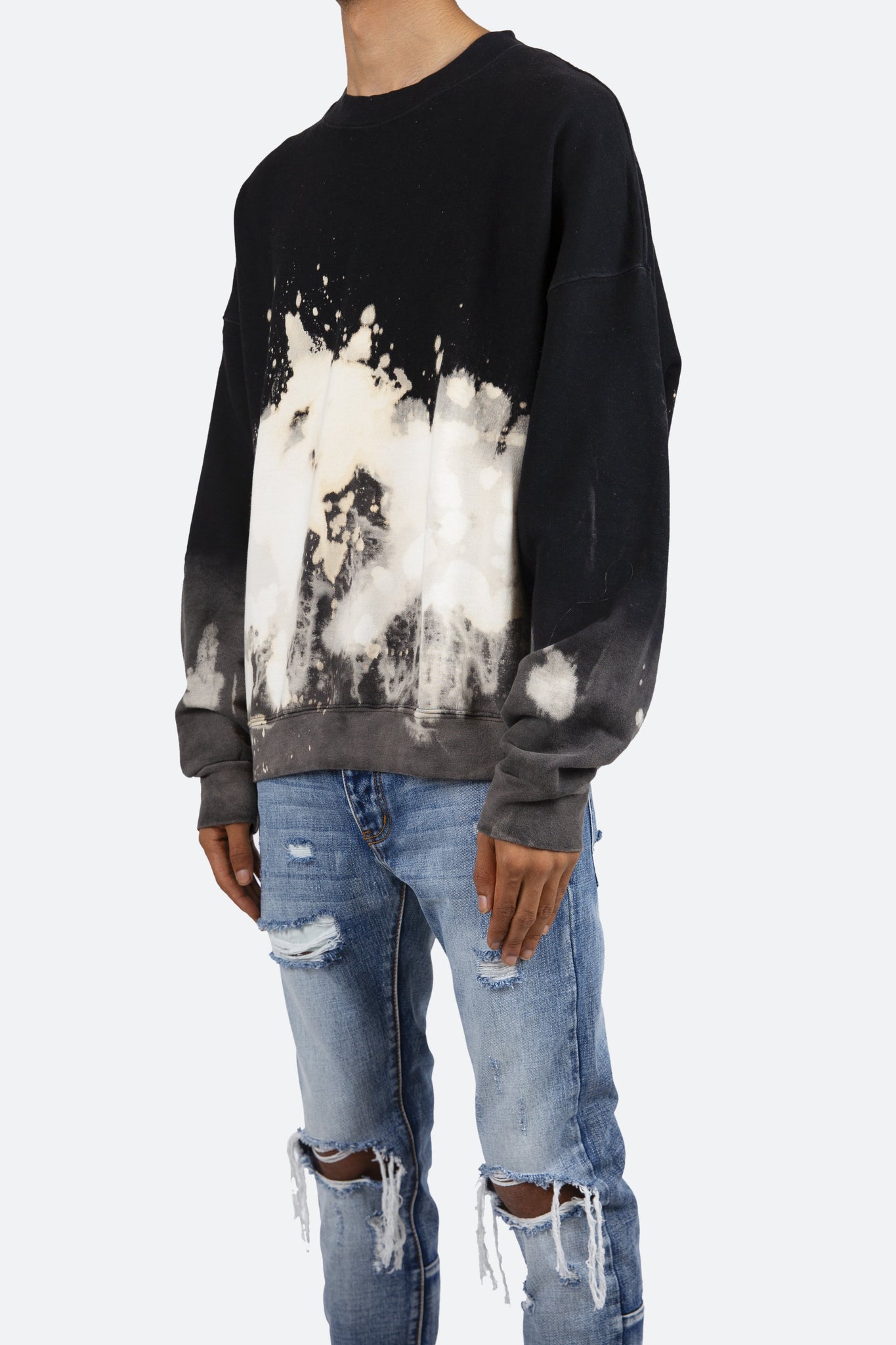 the Bleached Crewneck is made from 100% cotton french terry, featuring ribbing at the wrist and collar and hem, bleaching on the lower half of the garment, and finished in an oversized fit with a dropped shoulder design.