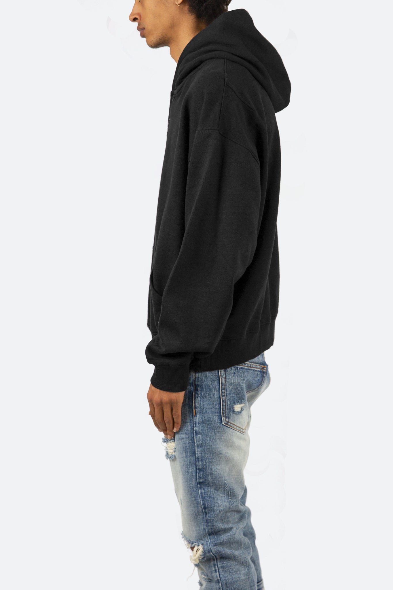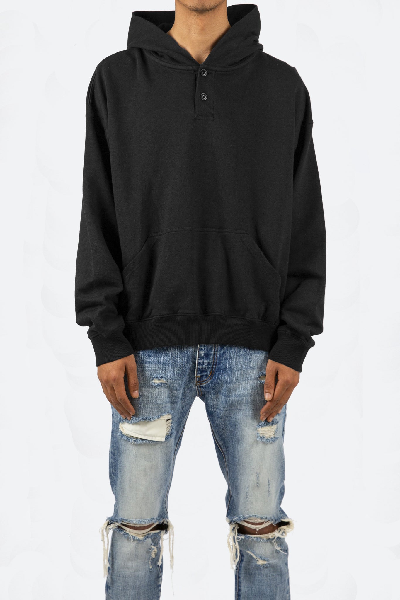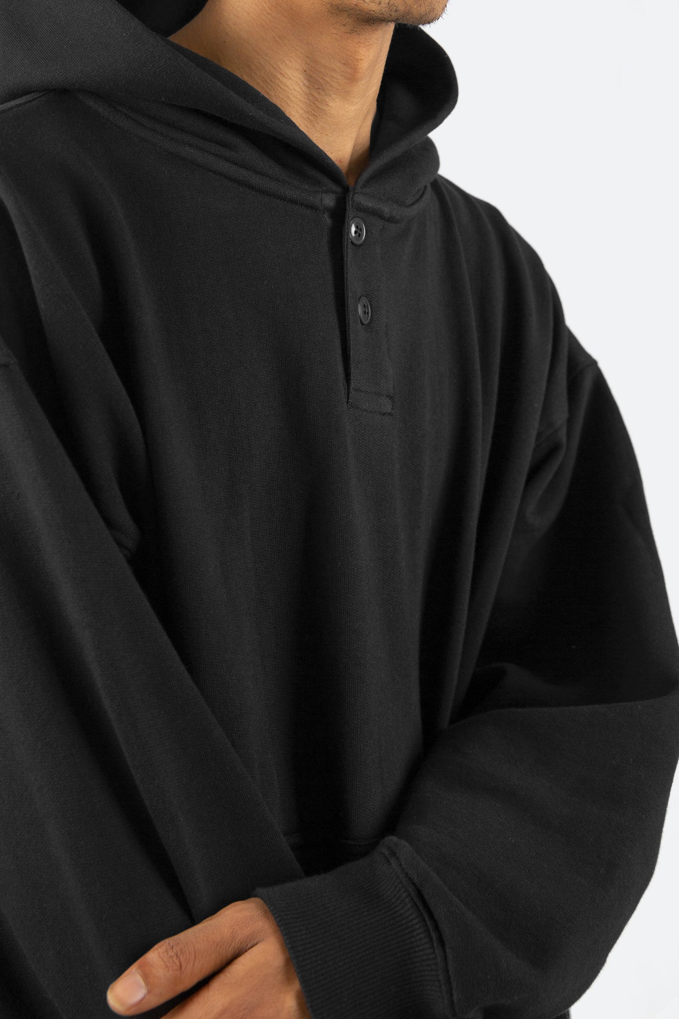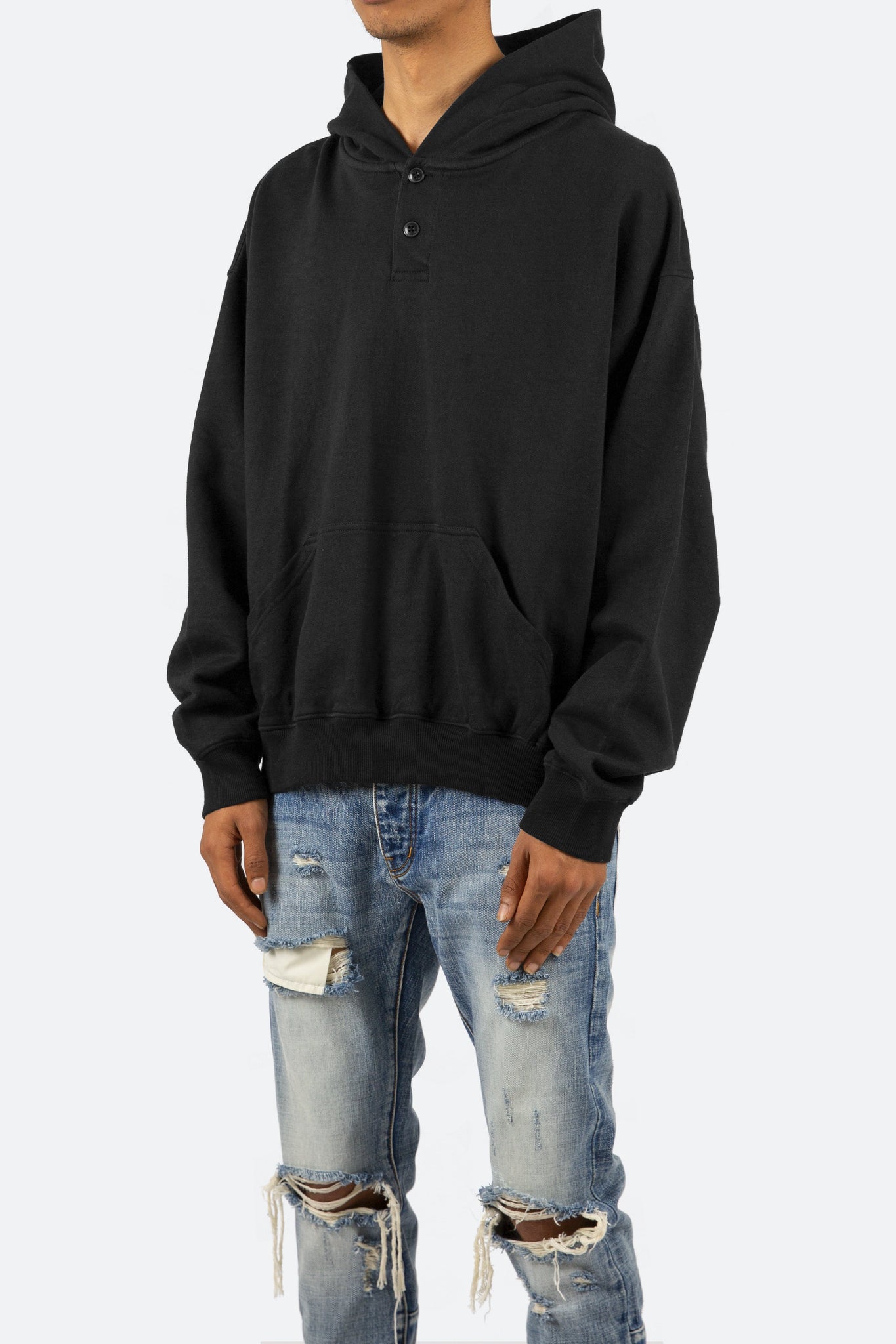 The Essential Henley Hoodie features a relaxed fit with a dropped shoulder design, front pouch pocket, ribbing at the wrists and waist, henley button collar and finished in a washed terry fabric.