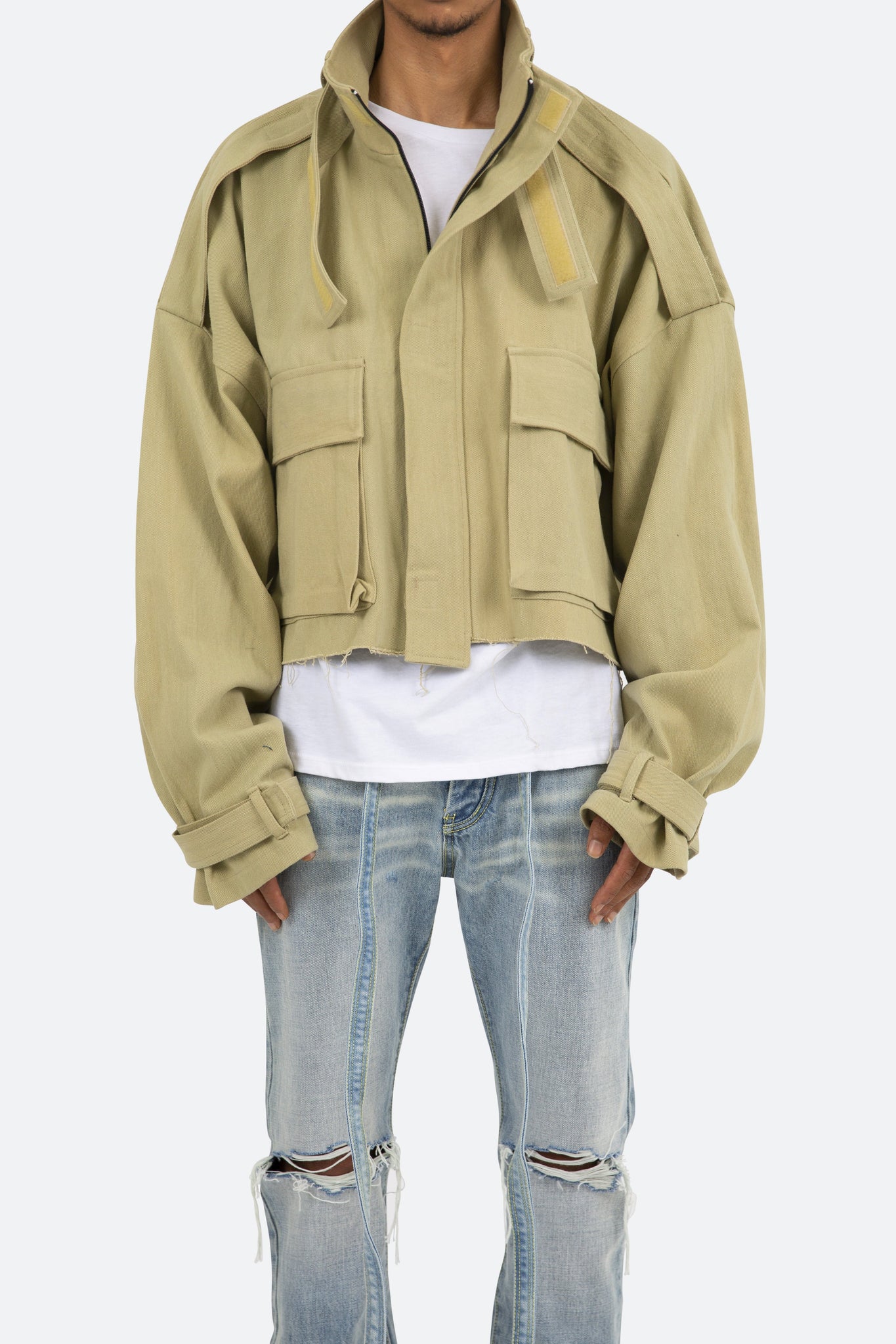 developed in Los Angeles, the Cropped M65 Jacket is designed with an oversized fit and features a cropped body, extended sleeves, zipper placket, cargo style pockets on the front, and finished with epaulettes at the shoulder and straps at the wrists.
