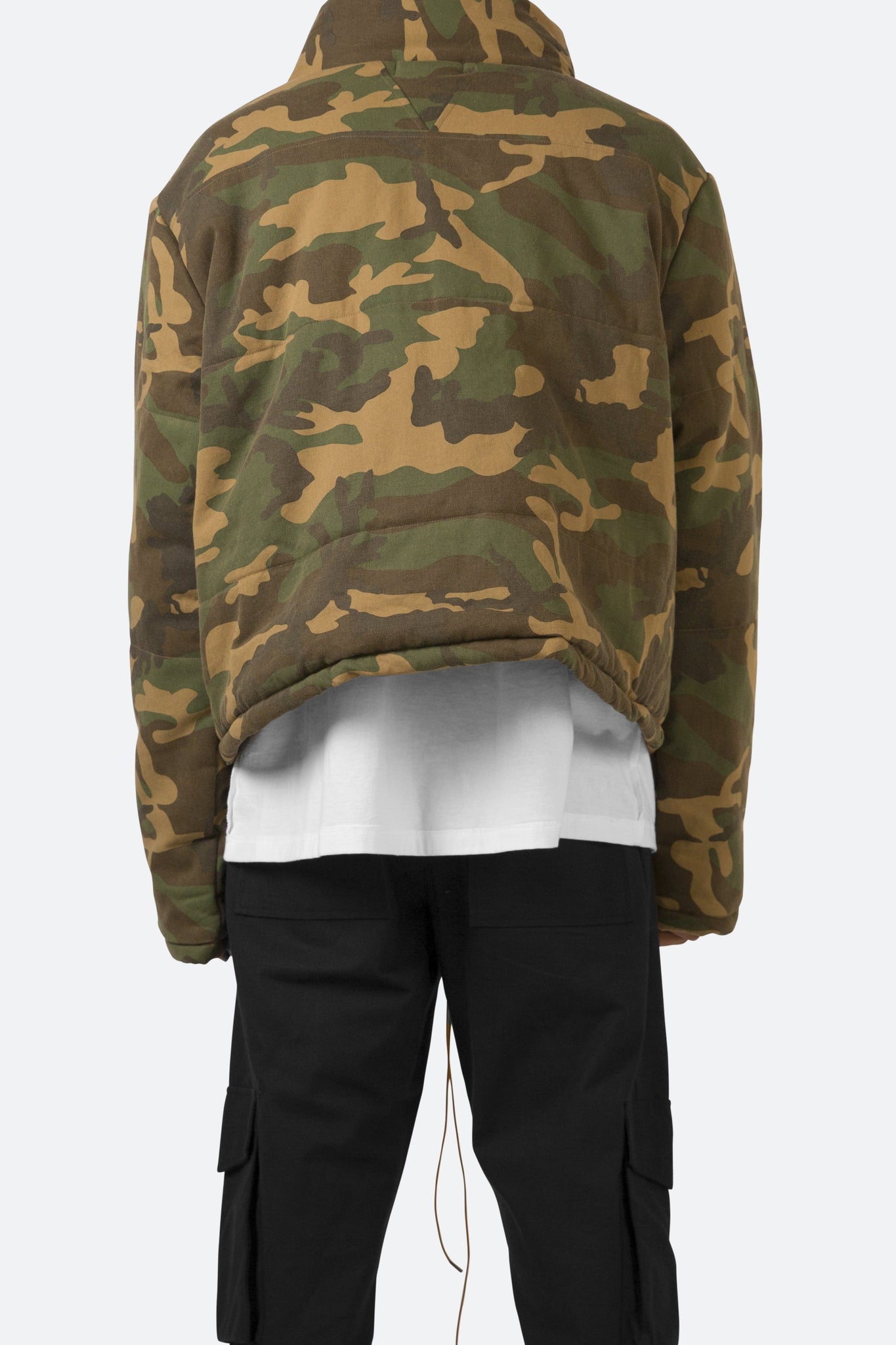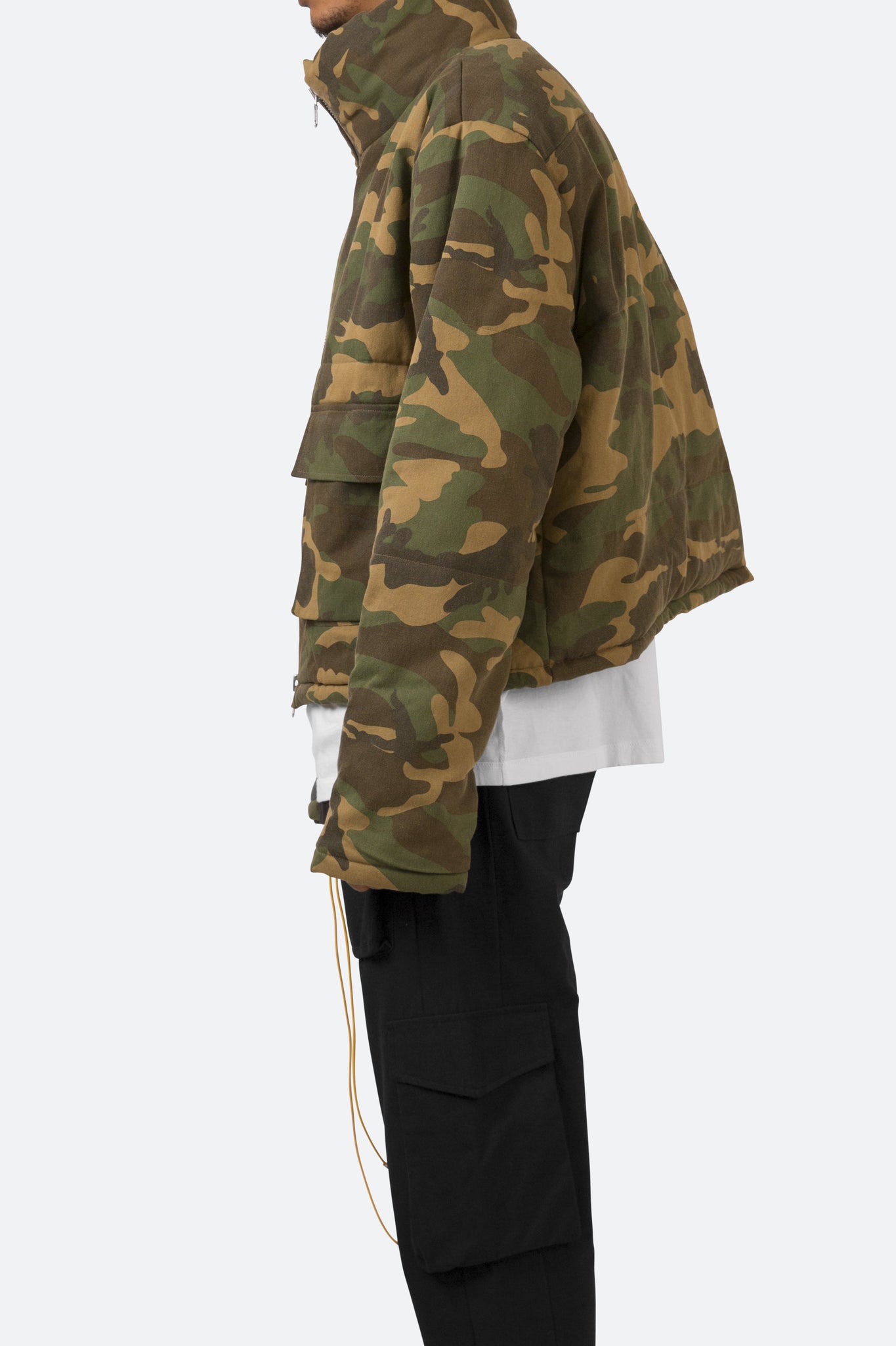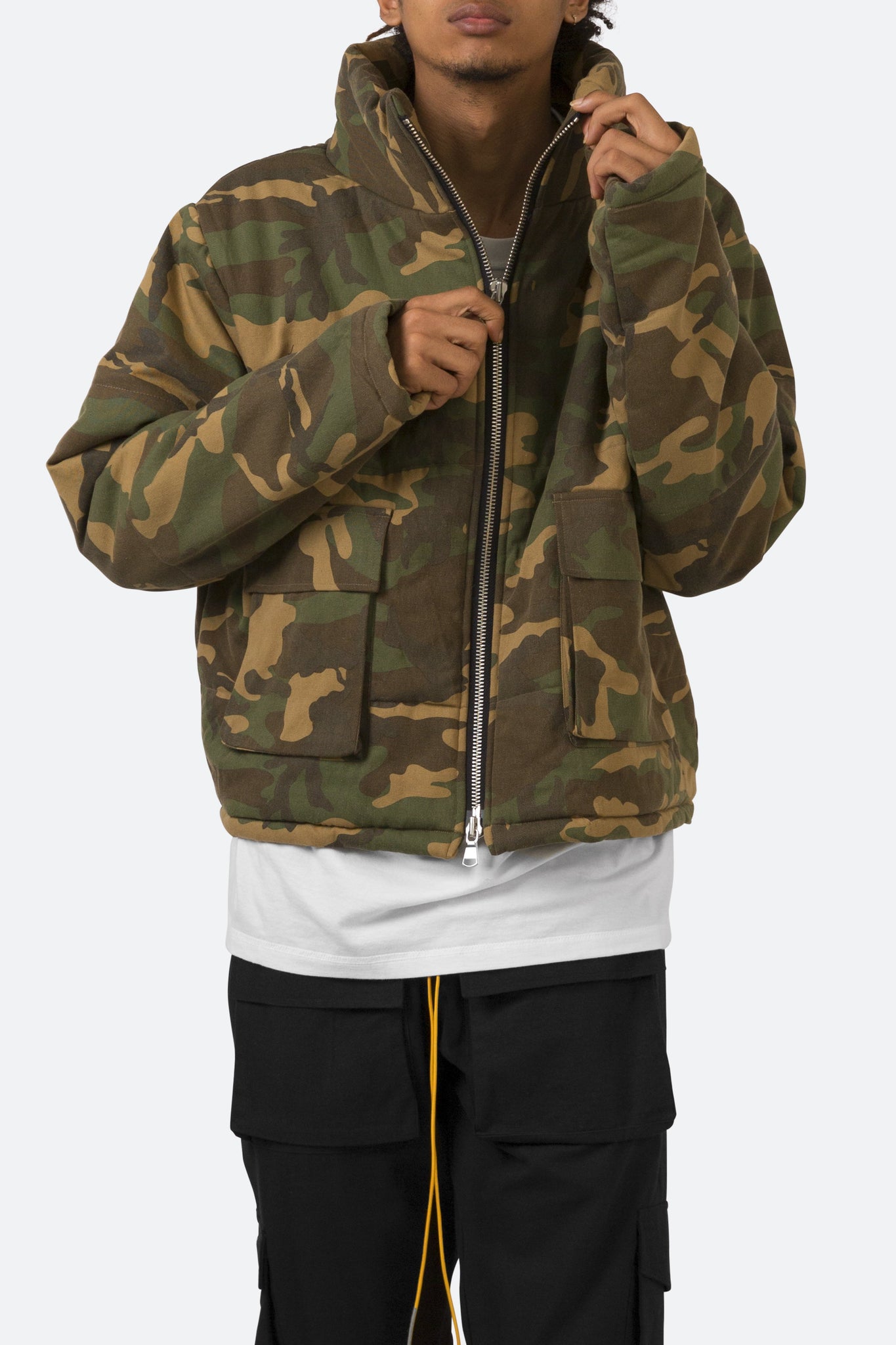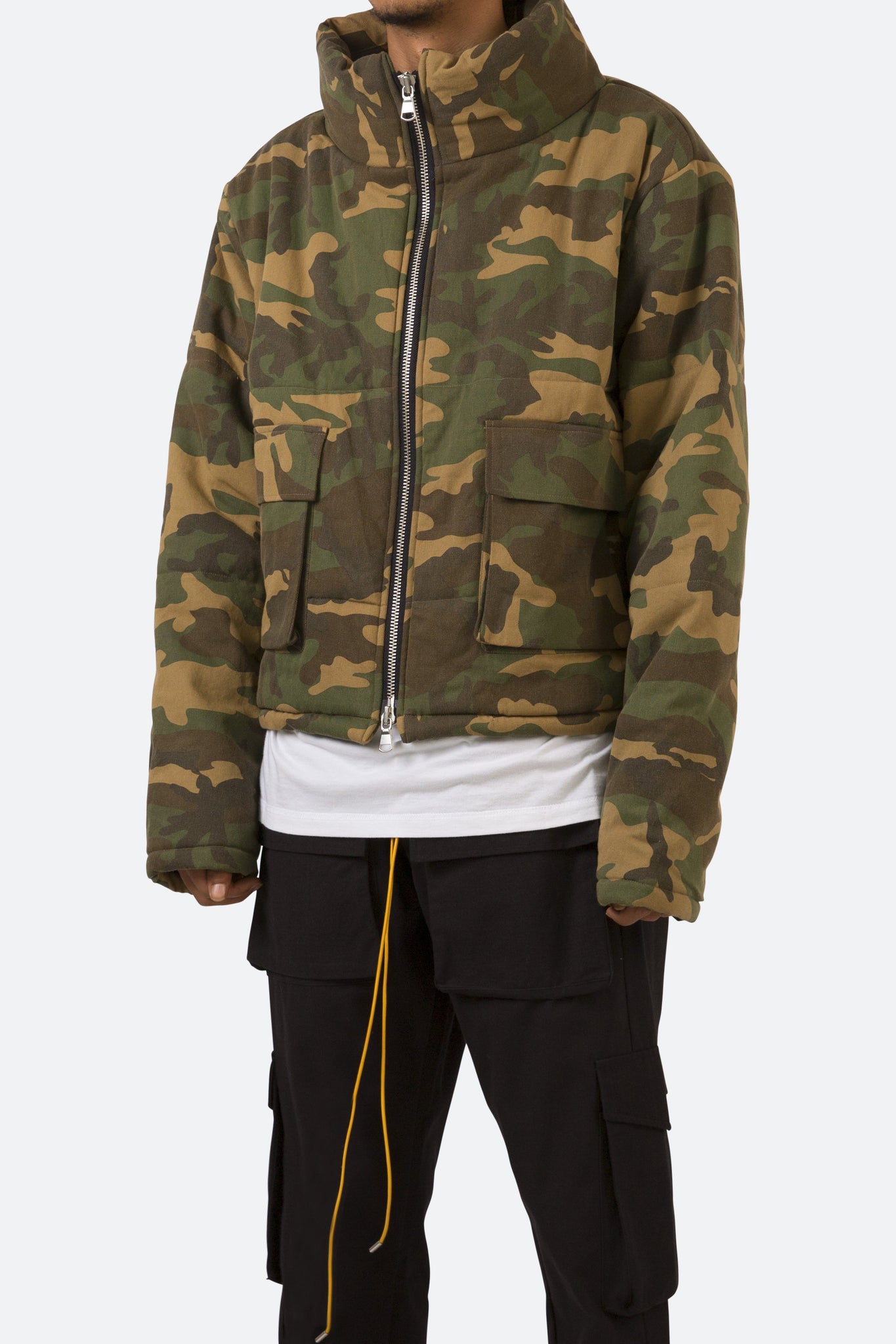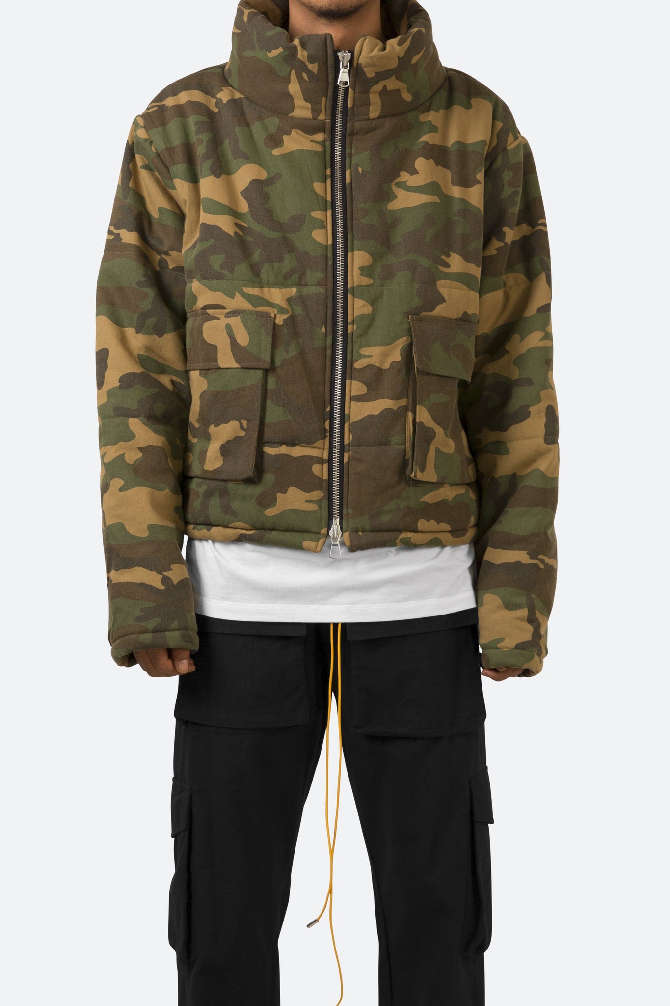 the Cropped Puffer Jacket features 2-way zipper closure at the placket, extended collar, black nylon lining, polyester filled and quilted, patch pockets on the front, cropped fit, and finished with a vintage wash.