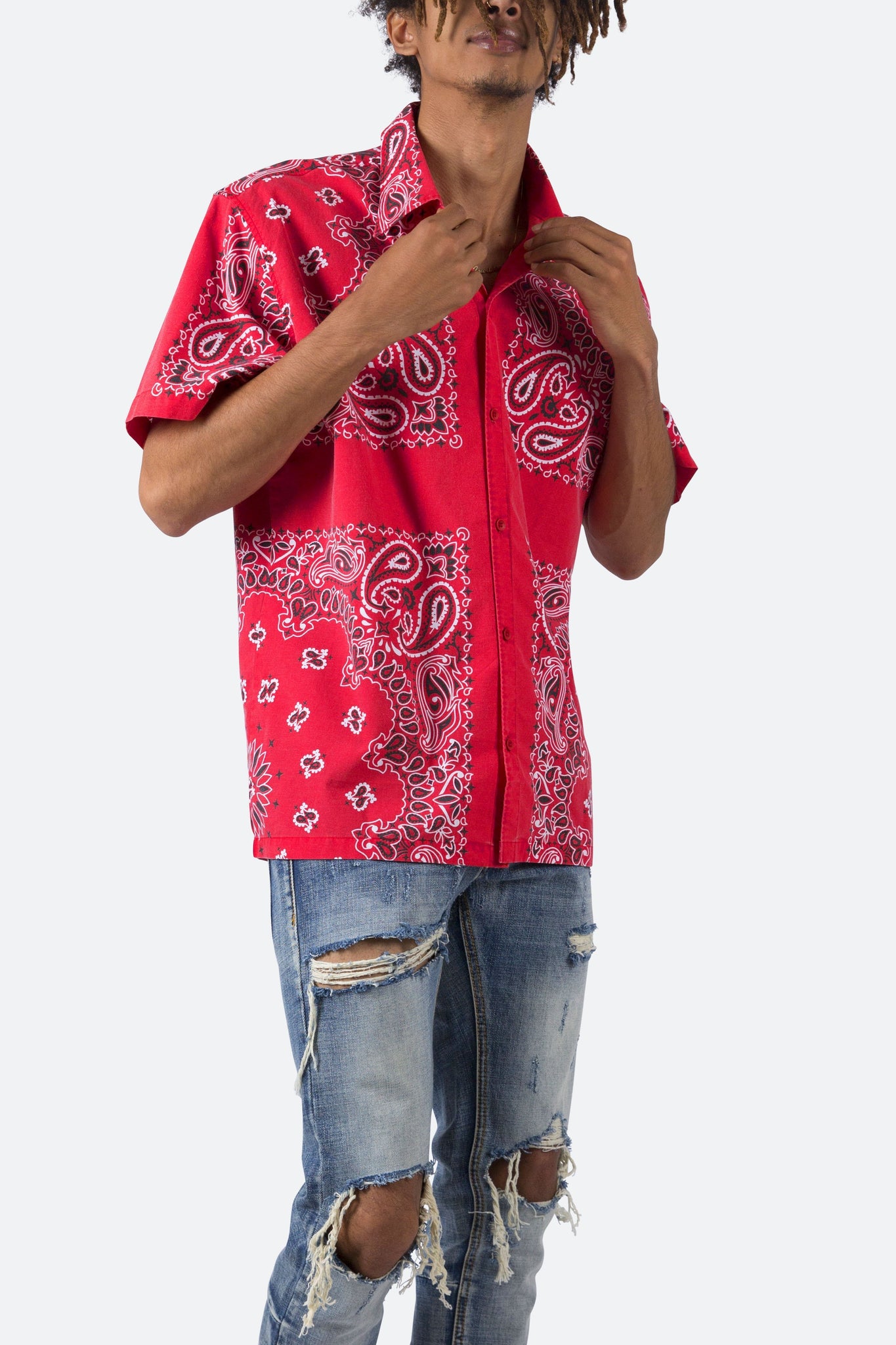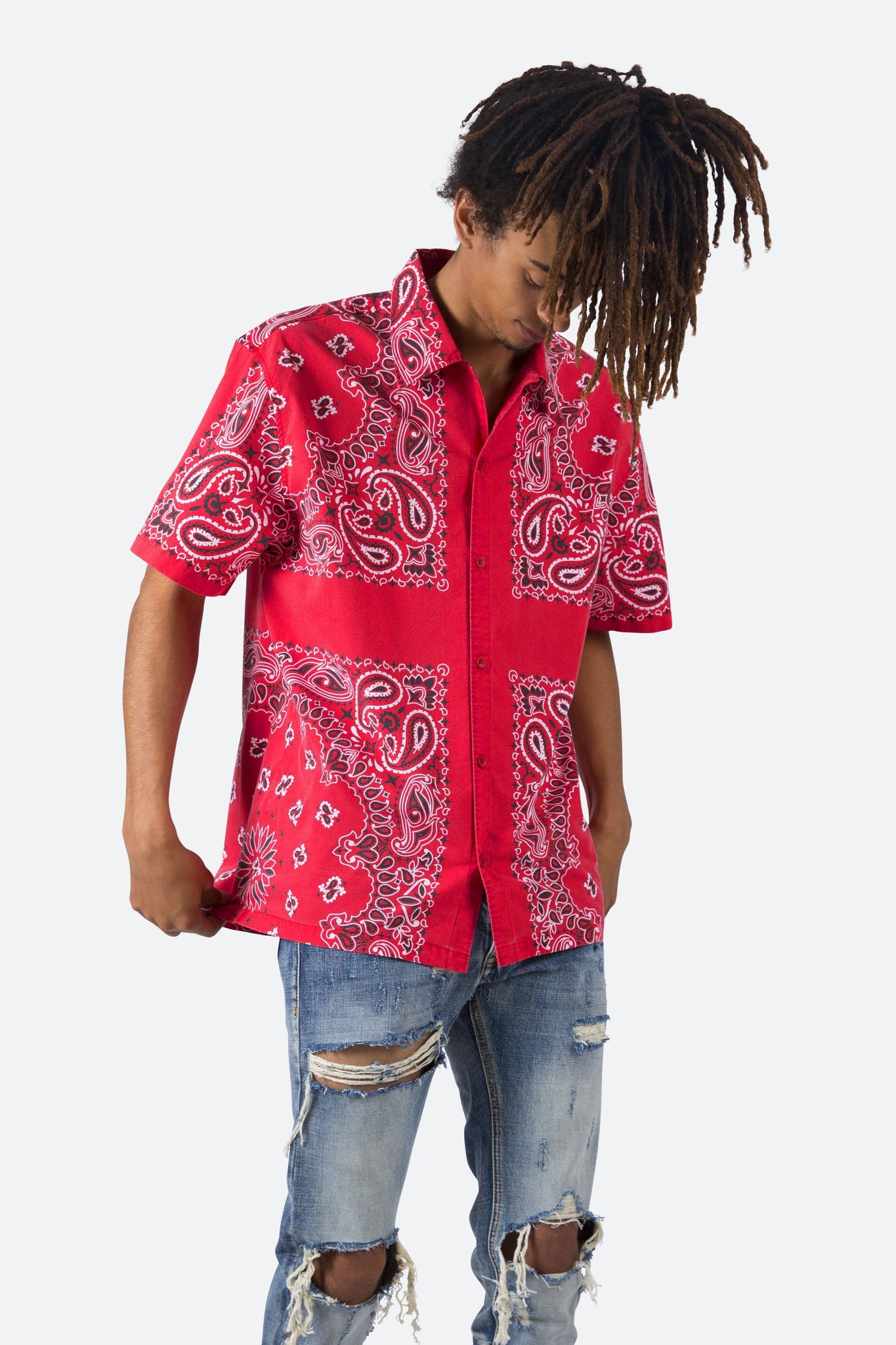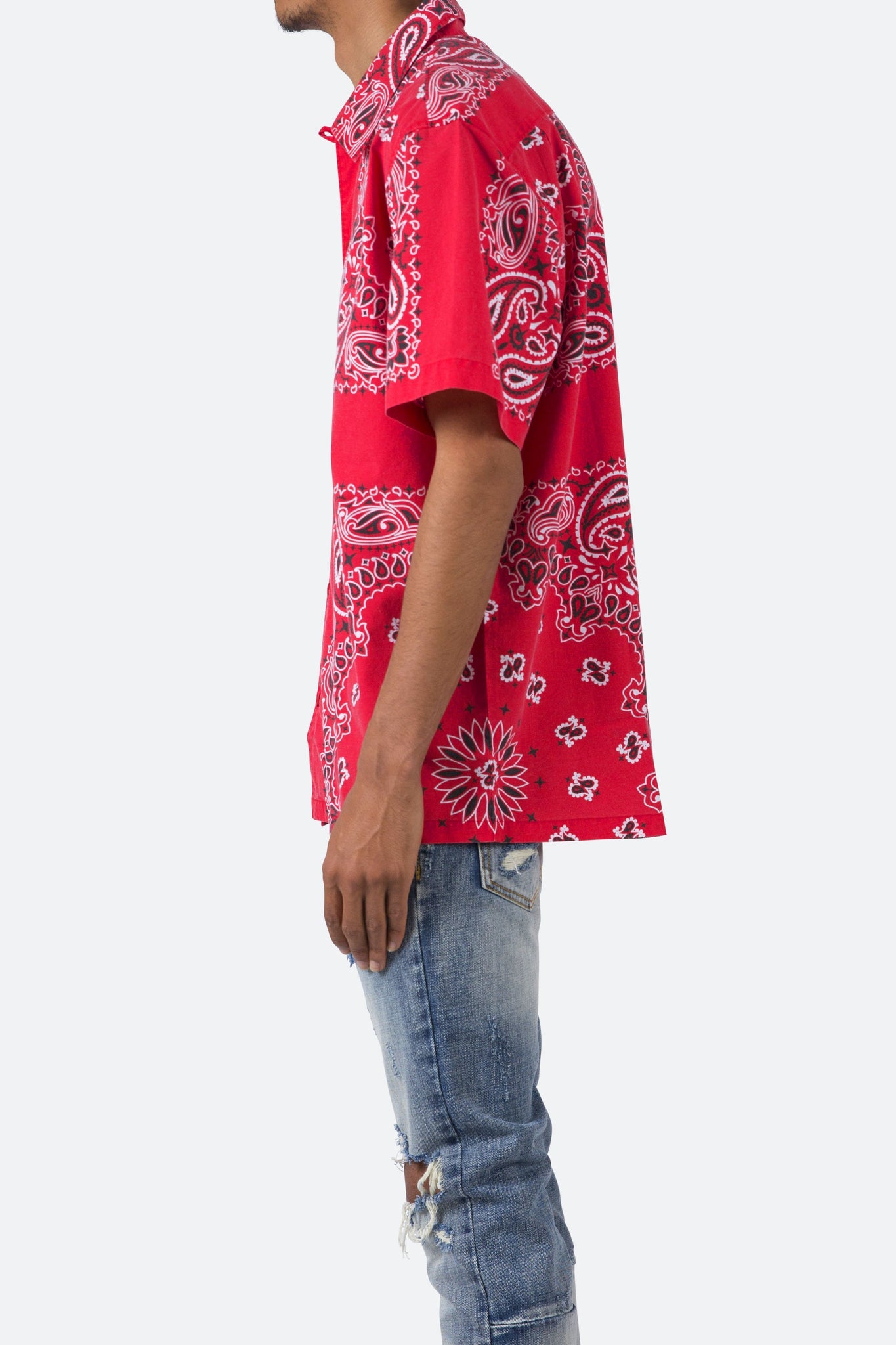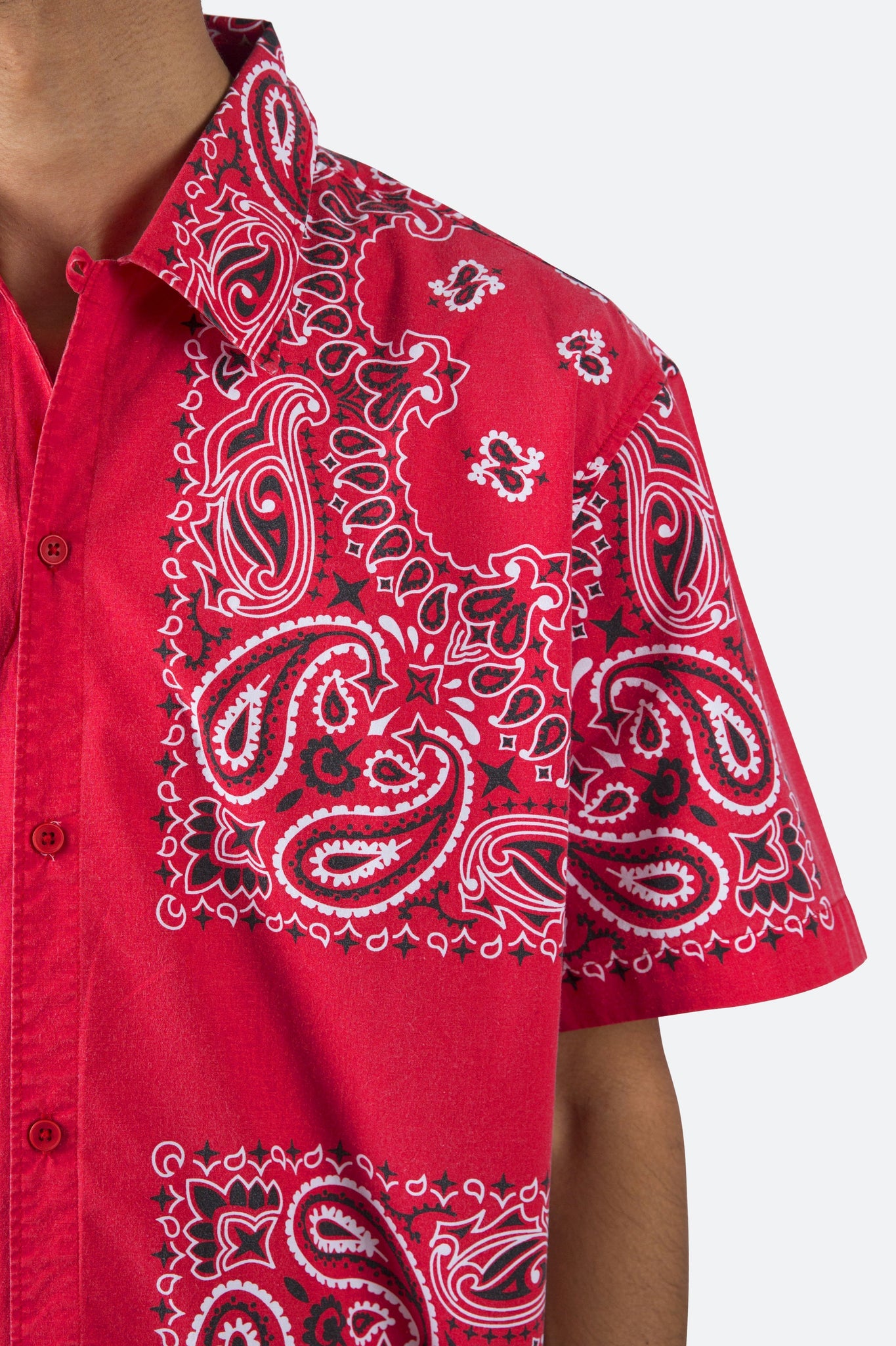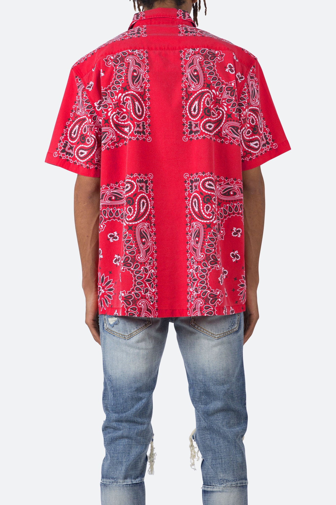 the Bandana Shirt is made from a cotton poplin fabric with a vintage wash. The relaxed-fit shirt features tonal buttons, and all over print paisley pattern.
